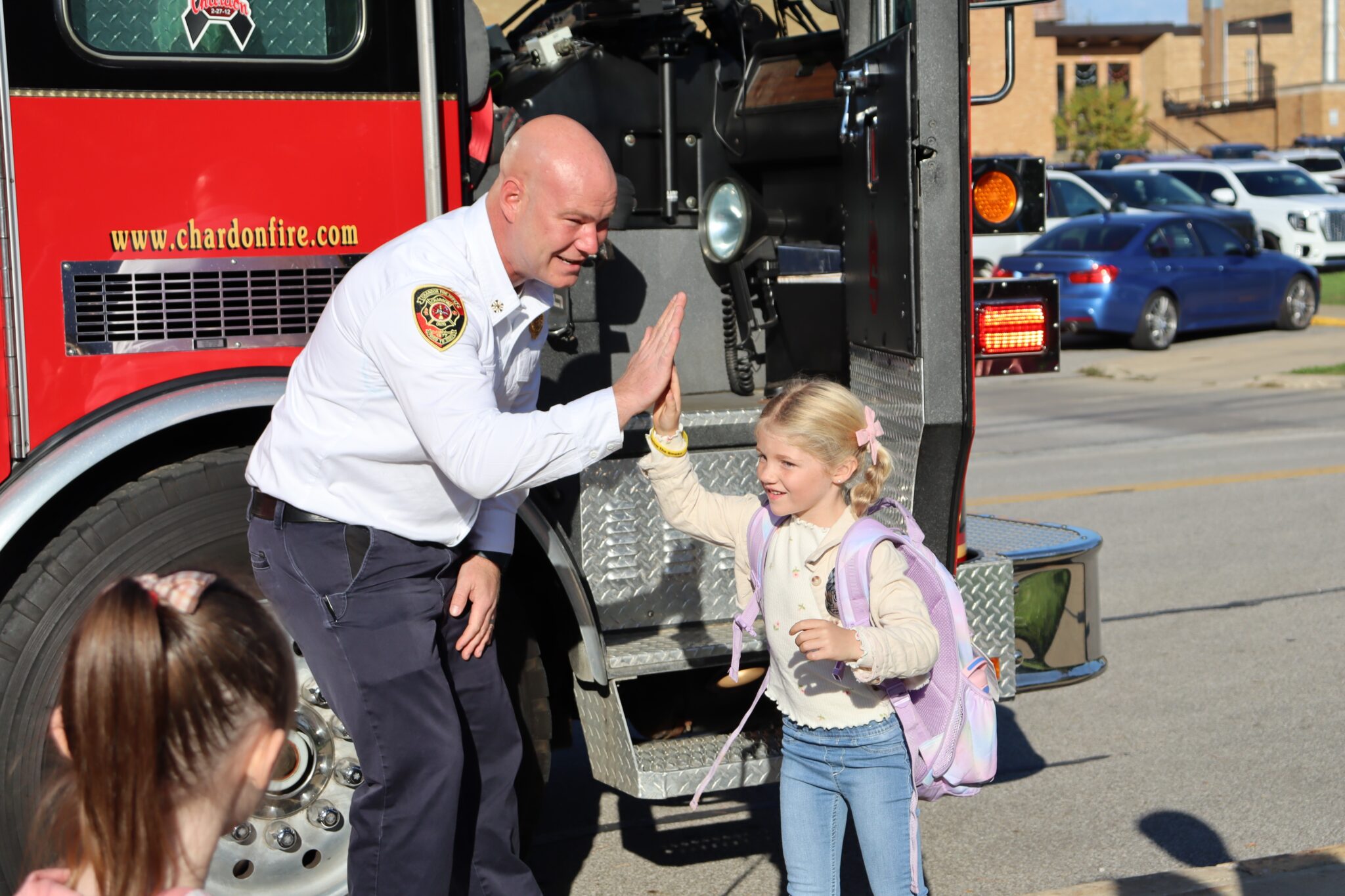 On Oct. 4, Chardon Early Learning Center student Madison Hamilton cruised into school alongside Chardon Fire Department Chief Justin Geiss on ladder truck 3349. Madison was greeted with excitement by her classmates and teachers, who awaited her arrival on the front lawn of the Early Learning Center.