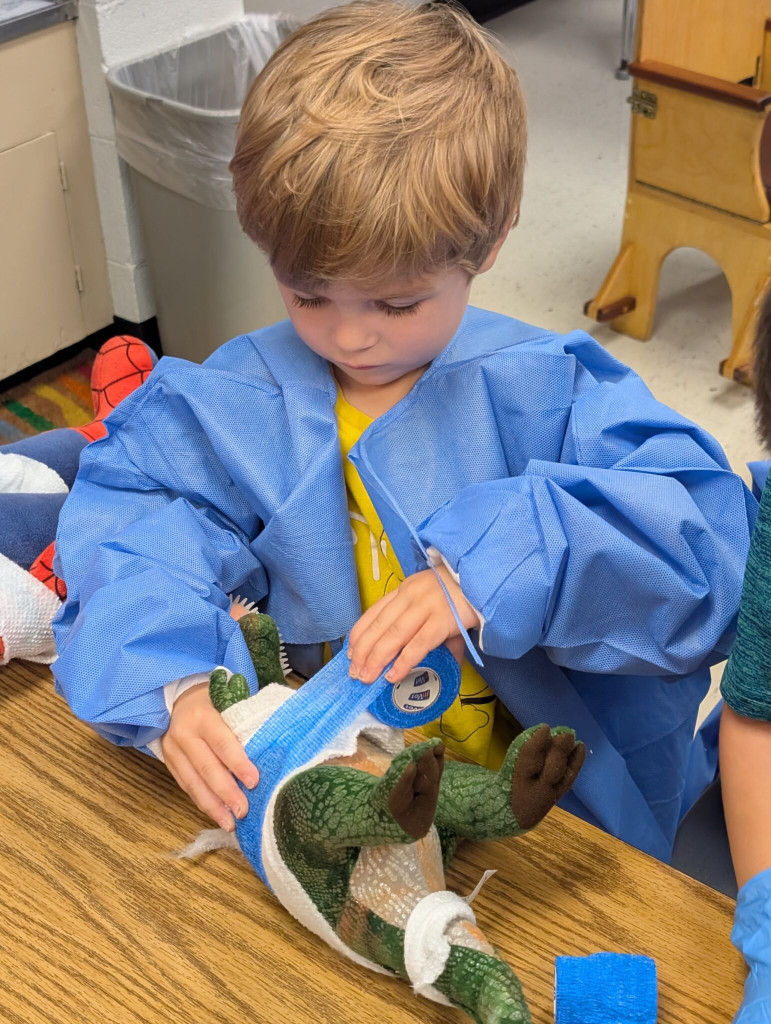 Students used their senses to try to figure out what Dr. Noonan had in her “feely boxes,” which included a stethoscope, dental tools and a post-surgery collar. Students looked at X-ray images of pets who swallowed items and tried to guess what they swallowed. They also put on scrubs and gloves to practice bandaging their stuffed animals.