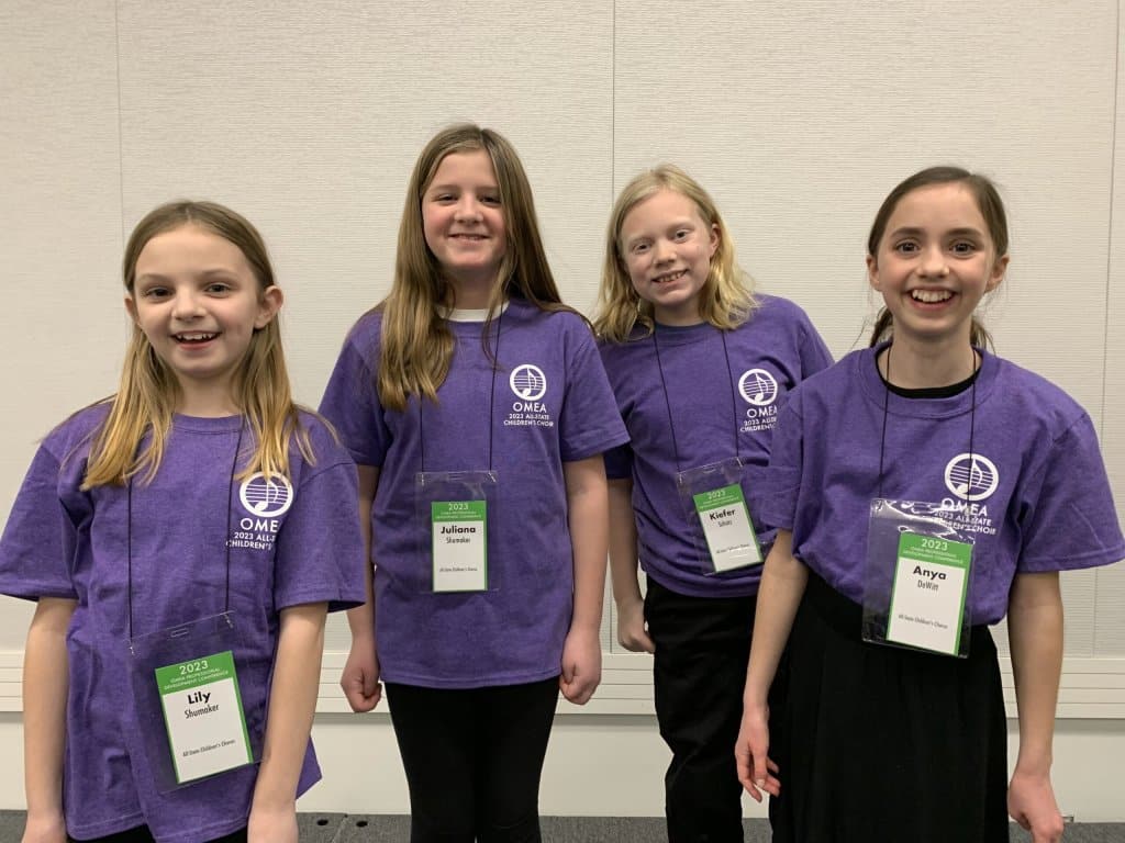 Three Kenston Middle School sixth-graders Lily Shumaker, Juliana Shumaker and Kiefer Schatz and Kenston Intermediate School fifth-grader Anya DeWitt, participated in the 2023 OMEA All-State Children’s Choir on Feb. 2 in Columbus. They recorded and submitted a vocal audition last spring with the help of district music teachers. All selected singers attended regional and state rehearsals and worked many hours independently to prepare for the concert. One hundred sixteen fifth- and sixth-grade students from across the state were chosen to participate in the choir.