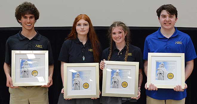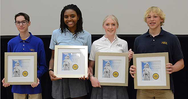 For exemplifying the mission of NDCL in their lives, seniors Kate Kaprosy, Caden Linnert, Vincent Mickey and Courtney Thomas received the Living the Truth in Love Award.