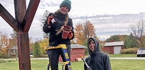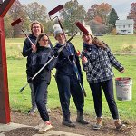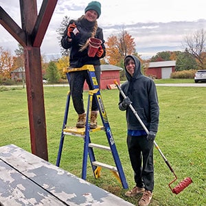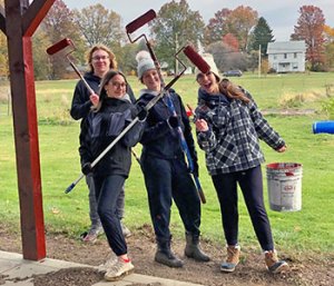 Students and campus ministers grabbed paint buckets, rollers and brushes last week to transform a little part of the world – one barn at a time – by lending a hand with painting projects at Hiram Farm.
