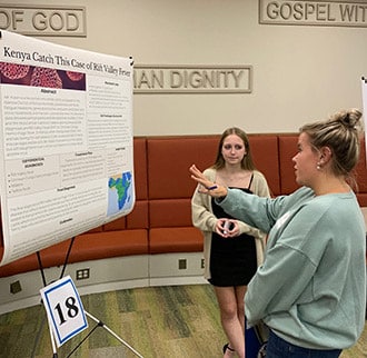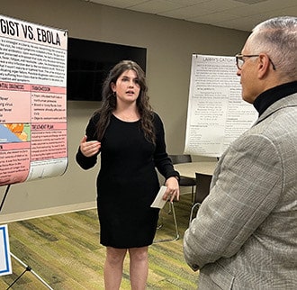 Twenty-two students in NDCL’s innovative biomedical studies course presented their differential diagnoses and fielded probing questions of actual case studies from several visiting medical and science professionals during the Biomedical Symposium on Nov. 30 in the Sisters of Notre Dame Learning Commons.