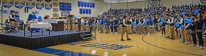 The celebration of Mass for the Feast of the Immaculate Conception of the Blessed Virgin Mary on Dec. 8 ended with a surprise twist as everyone in McGarry Gym simultaneously blew up nearly 1,000 personalized balloons before singing “Happy Birthday” to celebrate the birthday of our beloved Chaplain Father Jim Caddy.
