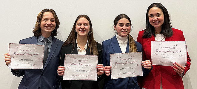Freshmen Quinn Linnert and Anneliese Moskal won the best witness awards, and seniors Victoria Baioni and Bailey Rice earned the judge’s nod as best attorneys.