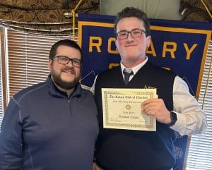 Sophomore Thomas Colosi, right, won the first-place prize in the annual Chardon Rotary speech contest on March 18 at The Lodge at Bass Lake. Impressed by his speech on social media, the Rotarians awarded Thomas $300. He will move on to represent NDCL at the district competition in Akron. A special thank you goes to NDCL speech teacher Leo Bond for his guidance and support.
