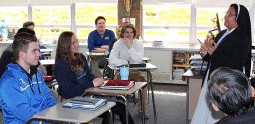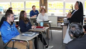 “I am so impressed by the community you have created here,” Sister Kharita told the students in Theology Department ChairpersonMichelle Nowak‘s Theology 12 class.