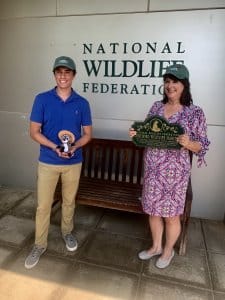 Pierce Thomas, a senior at Notre Dame Cathedral Latin High School, joins Mary Phillips, former alumna and senior director of Wildlife Gardening, at the National Wildlife Federation (NWF) to accept the plaque, which recognizes NDCL’s campus as a Certified Wildlife Habitat.