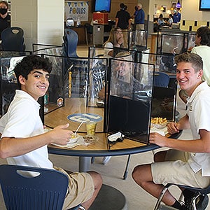 To maintain physical distancing in a fun way, NDCL is treating the cafeteria like an event center, with students being called up to the serving line table-by-table. NDCL is playfully calling the cafeteria the Poulos Party Center, named after Assistant Principal Chris Poulos. Many students are also eating lunch outside at new bistro-style umbrella tables that fill the courtyard, now known as the Poulos Patio.