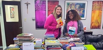 In just one week, students cleaned out the shelves and bookcases of their homes to donate more than 2,000 titles for the children at Saint Adalbert, Saint Francis, Saint Thomas Aquinas and Saint Jerome schools.