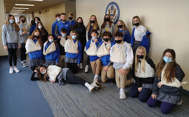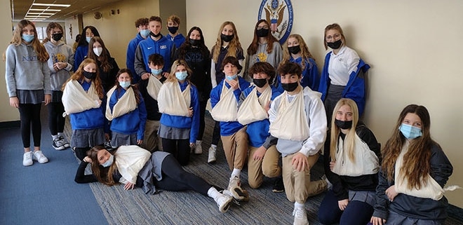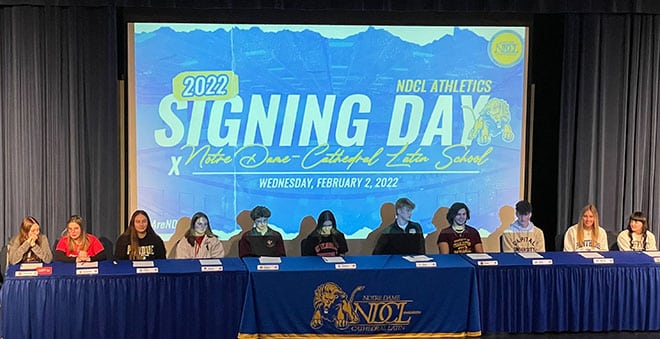 Eleven student-athletes declared their collegiate athletic intentions during a spirited signing ceremony attended by many relatives, coaches, teachers and teammates in NDCL’s O’Brien Center the morning of Feb. 2.