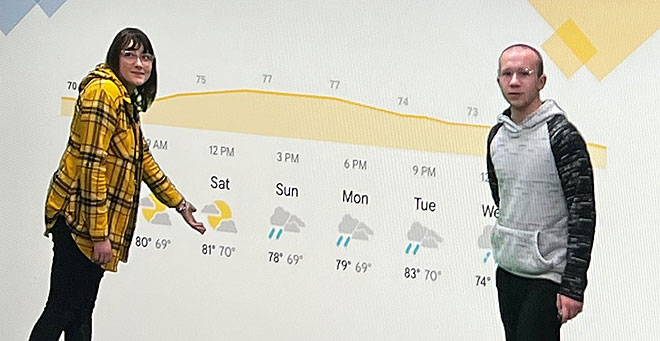 During a week when every NDCL student was focused on the weather in hopes of a snow day and others were looking to Punxsutawney Phil on Groundhog Day for signs of an early spring, students in science teacher Elizabeth Ford’s environmental science class used their learning about weather as well as their media expertise to produce meteorological broadcasts in NDCL’s TV studio in the Sisters of Notre Dame Learning Commons.