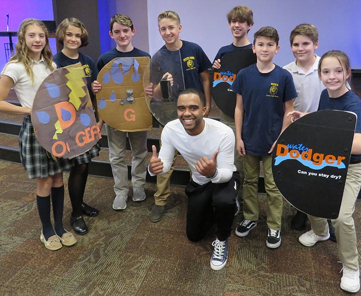Junior high students recently had the opportunity to meet with Nate Eaton, winner of the second season of ABC’s “The Toy Box,” who inspired our students to be inventors. Nate is a 2017 graduate of Hiram College and is from the Cleveland area. He shared his inspirational life journey along with the design and testing process of his invention, the Hydroshield Water Dodger. Through his journey, Nate “kept his faith and stayed focused on his dream.” According to Nate, anything students think about, they can create.