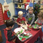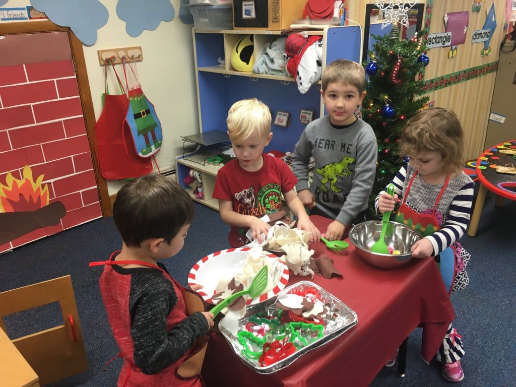 All of the classrooms are enjoying the holidays in their dramatic play centers. The pre-K classroom has a hot chocolate stand, the 3-year-old classroom has a mail delivery center and the enrichment classroom has a cookie baking kitchen. Learning these skills through play is very important developmentally for young children and they have been taking a great ownership over their learning in the centers.