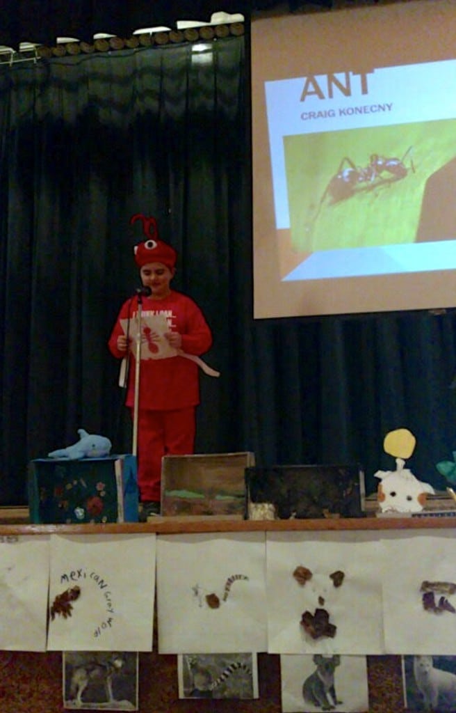 To bring it all together, there was an animal investigation presentation in the auditorium. Parents were invited to come and hear the students read their reports while dressed up in animal costumes. The students also got to display the diorama of their animal and its habitat that was completed at home.