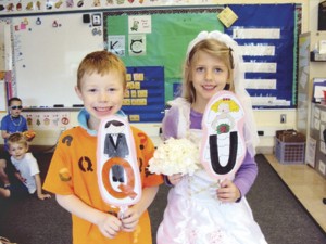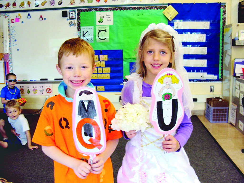 The Q and U wedding was an event to remember at Newbury Elementary School. Mr. Q (Anderson Louden) and Miss U (Jadyn Brendy) joined their fellow letters in celebrating this union that is always the case as they come together to spell words.