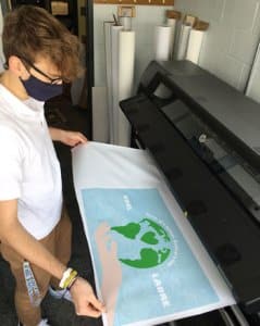 Graphic design teacher Megan Staudacher recently challenged her students in NDCL’s Digital Design II to use their creativity and technical skills to create posters and banners to promote charitable organizations and causes. Senior Bobby Hovanes chose to design a banner supporting a cause near and dear to his heart: NDCL’s Labre Ministry with the poor and homeless. He used NDCL’s sophisticated large-format printer to produce the banner, which he presented to Director of Campus Ministry Halle McKeon.