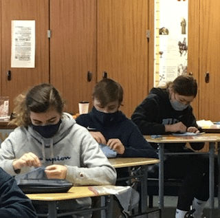 The eighth-graders took a break from books and set out on the process of learning how to sew in religion and health...