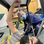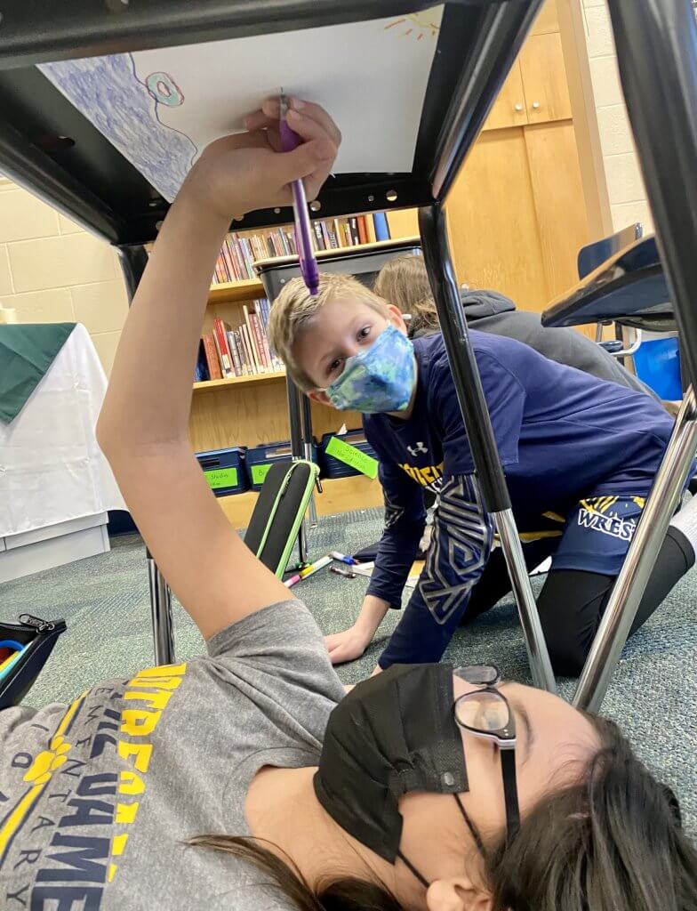 Fifth-grade ELA classes are studying the Renaissance. After reading about and discussing the artist Michelangelo, students got an understanding of Michelangelo’s grueling task of painting the Sistine Chapel ceiling by creating a scene underneath their desks.