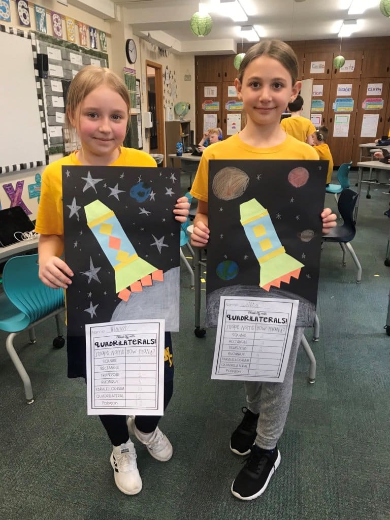 Third grade has blasted off into geometry world the week of March 28. They’ve started learning how to define polygons using geometric attributes such as what types of angles the shapes have, how many pairs of parallel lines make up the shape or the lines of symmetry they can create in the shape. Students have also learned that squares, rectangles, rhombuses, trapezoids and parallelograms all share attributes and that those shared attributes can define a larger category of shapes —- quadrilaterals.