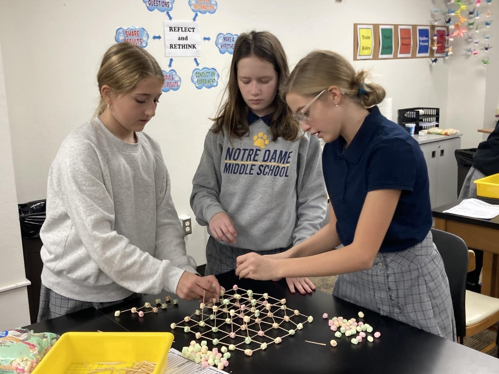 The sixth-grade STEM classes used toothpicks and marshmallows to build a rectangular or square pyramid...