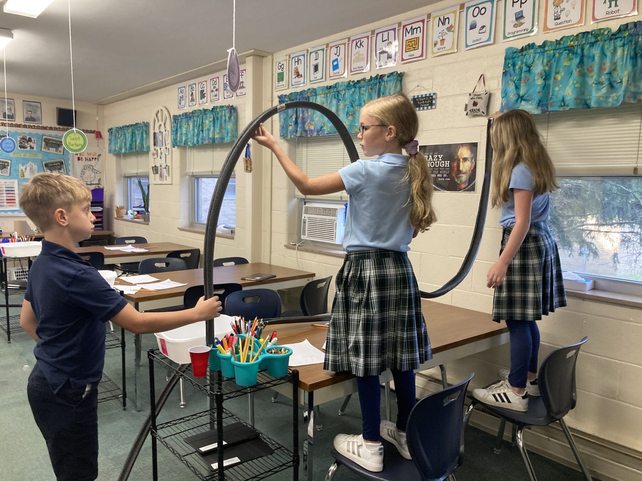 In STEM class, the fourth-grade students experimented with plumber's foam, masking tape and marbles to see how the success of a roller coaster is affected when the second hill is taller than the first hill...