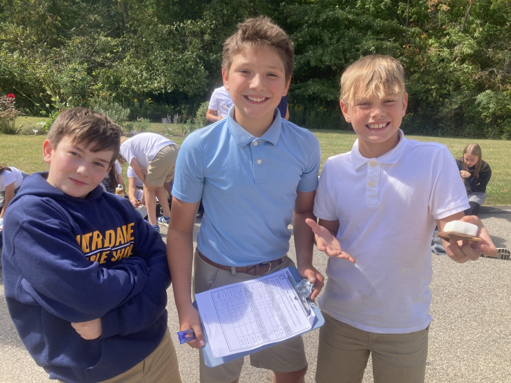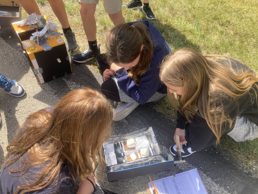 Sixth-graders worked in teams to design solar ovens with certain constraints and criteria that they placed outside to see how effective they would be at making s’mores. Due to the nice weather, students placed the solar ovens outside for a couple of hours. Before setting the solar ovens out, students measured the diameter and width of chocolate and a large and small marshmallow. When they went outside to see what happened over the course of two hours, students had to measure the chocolate and marshmallows again to see if there were any changes in size. Students used the measurements and observations to assess the effectiveness of their project and reflect on things that worked and those that did not. The best part of the experiment was eating the s’mores when they were done measuring.
