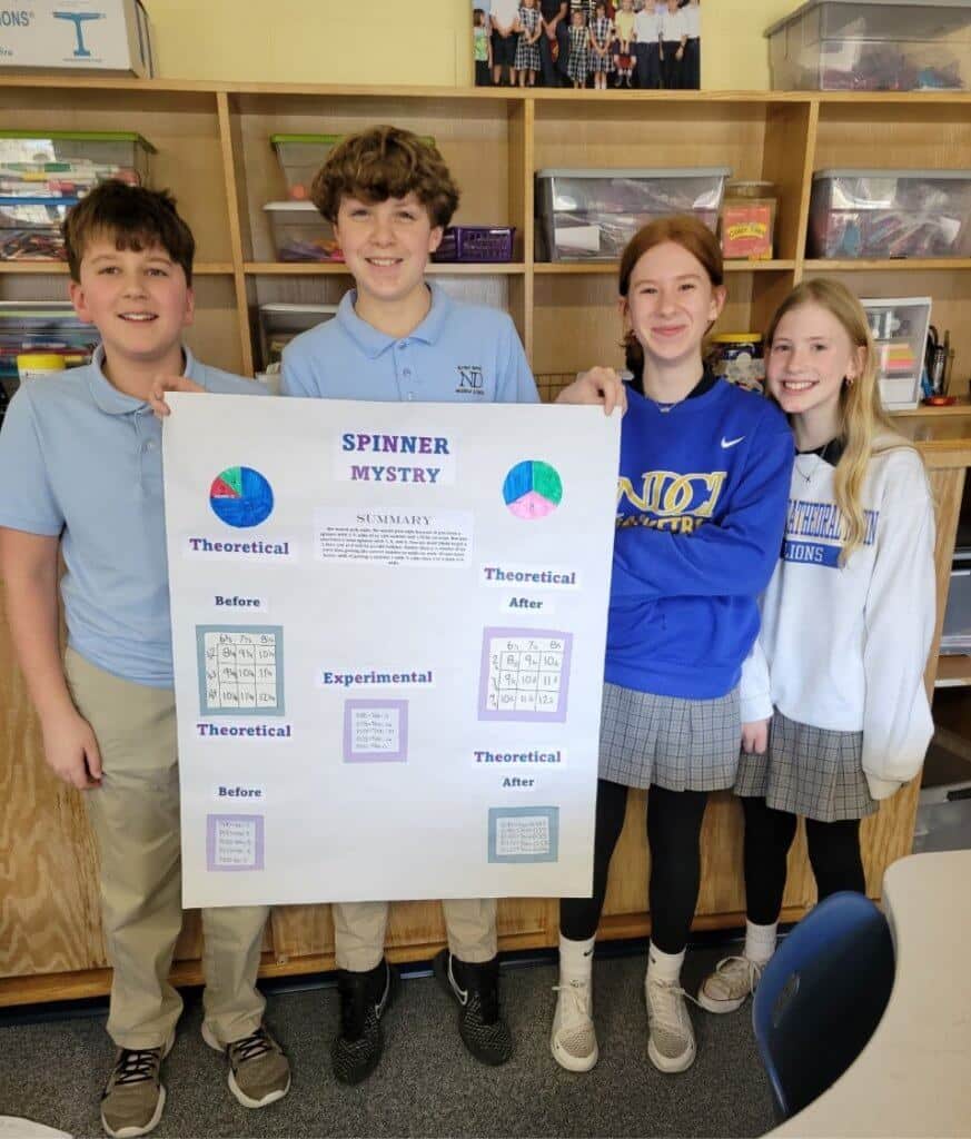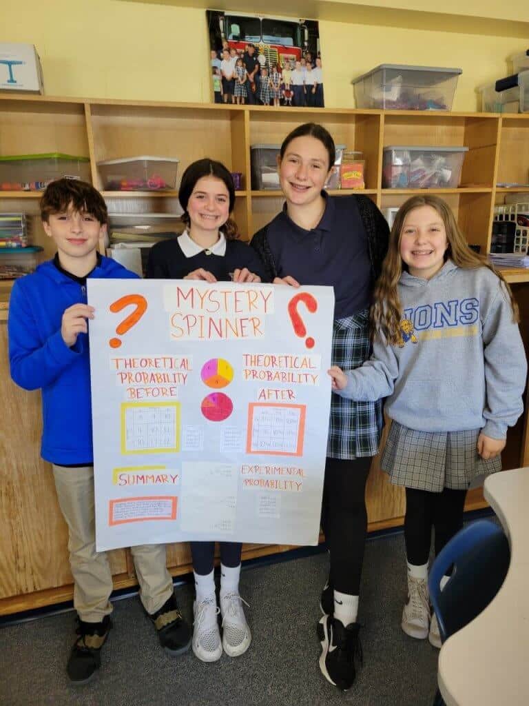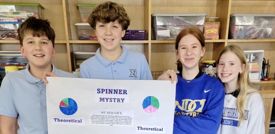 Students in Mrs. O’Brien’s seventh-grade math class are learning about compound probability. Students played a game by spinning two mystery spinners. They collected data and then calculated the probability of the outcomes with theoretical probability before playing the game and experimental probability after playing the game.