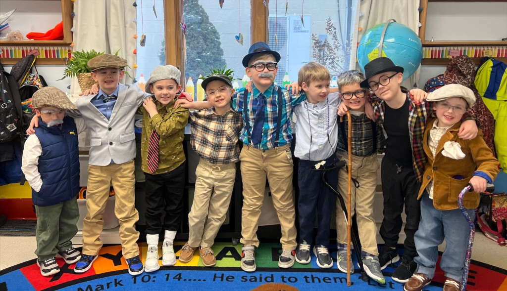 The kindergarten and fourth-grade students at St. Helen School marked the 100th day of school, celebrating all the learning they have achieved up to this point. The kindergarteners dressed up as 100-year-old individuals, while the fourth-graders embraced the fashion of different decades.