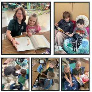St. Helen fourth-graders read with their Little Hornets pre-K prayer partners, guiding them through colorful pages with smiles and laughter. The room is filled with warmth as eager prekindergartners listen, fostering a special bond through faith and learning.