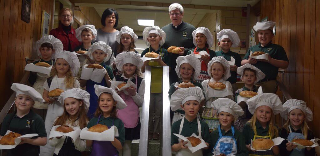 With the help of many moms and grandmothers, the second-graders at St. Helen School experienced the joy of bread baking as they prepare to receive Jesus, the Bread of Life. Each student created a delicious loaf of bread to share with his or her family to celebrate First Communion on May 5. With the second-graders are Principal Margaret Hartman SND, second-grade teacher Hope Bartholomew and Fr. Jay McPhillips.