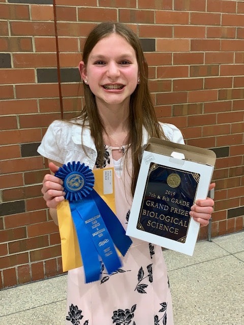 Joslyn Borah’s project, comparing hydroponic and aquaponic systems for food production processes, earned first place in the biology category and was also chosen as one of the two grand prize winners from all seventh- and eighth-grade projects entered this year. In addition, Borah’s project, “I Just Wet My Plants,” was recognized by two organizations – the American Society of Heating, Refrigeration, and Air Conditioning Engineers and Cleveland Clinic’s Learner Research Institute – for special prizes.