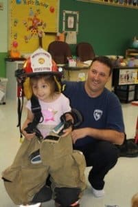 Emma Majetich tries on the uniform of Newbury Volunteer Fire Department Lt. Jeremy Sustar during his annual visit to St. Helen Preschool.