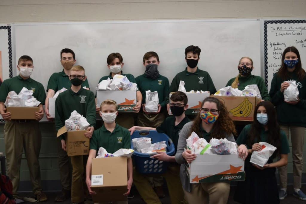 Students brought in various food and drink items and placed them in bins in the atrium of the school. Each class decorated lunch bags with words of encouragement. The eighth-grade class filled the bags each week. The bags were then picked up by volunteers who distributed them to the homeless.