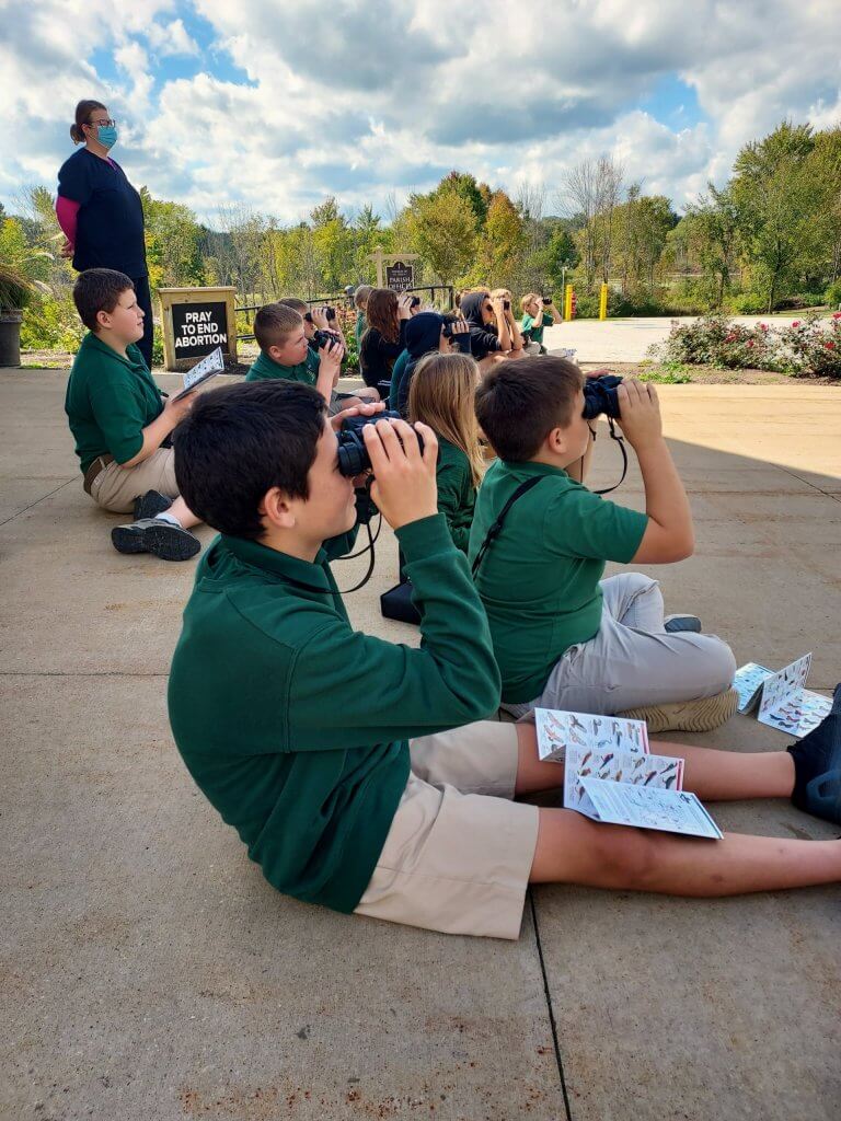 Fifth-grade students, under the direction of their teacher Natalie Hudak, had their first Nature Scopes lesson with naturalists from the Geauga County Park District the week of Oct. 11. Each year the park district gives the fifth-grade class their own binoculars to keep. The students practiced using their binoculars to see things far away and then flipped the binoculars over to use as microscopes to magnify flowers, leaves, rocks and other natural items.