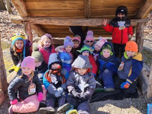 Students in St. Helen Preschool’s Little Hornets class huddled under a lean-to at Swine Creek during their maple sugaring field trip...