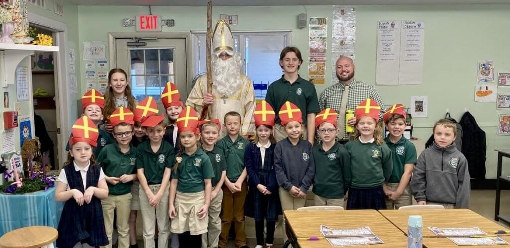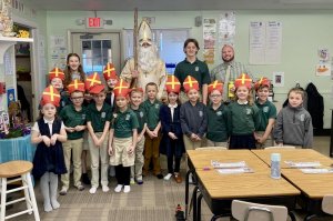 St. Nicholas visited St. Helen School on Dec. 6 to deliver a sweet treat to the students, including Miss Rafftery’s first-grade class. Students put their shoes outside the classroom doors and were surprised to see candy canes left after his visit.