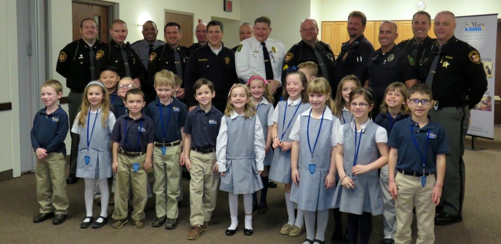 Representatives from the Chardon police and fire departments, Geauga Sheriff’s Office, Ohio Highway Patrol and Hambden Fire Department were all in attendance despite busy schedules and some on their days off. Each met in the church gathering space and processed in with the children behind the American flag. During the Mass, the students and community asked for special blessings to keep our public servants safe. The community attendees were choked up as the first-graders then read a touching poem that honored all of the local heroes and highlighted many of their sacrifices.
