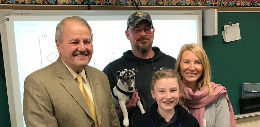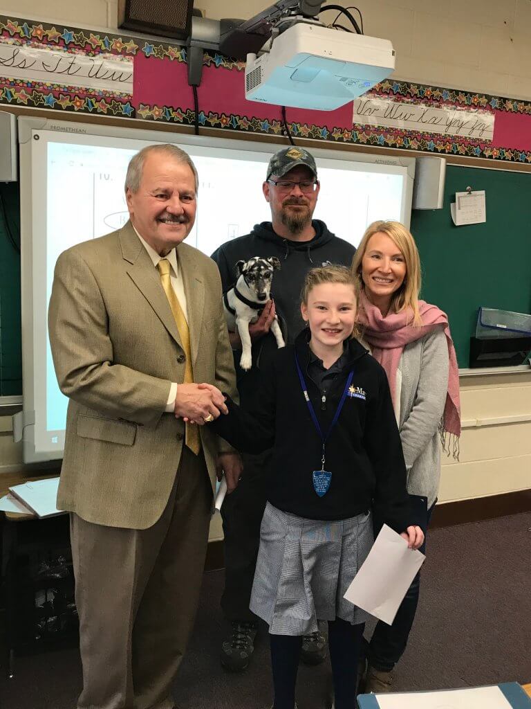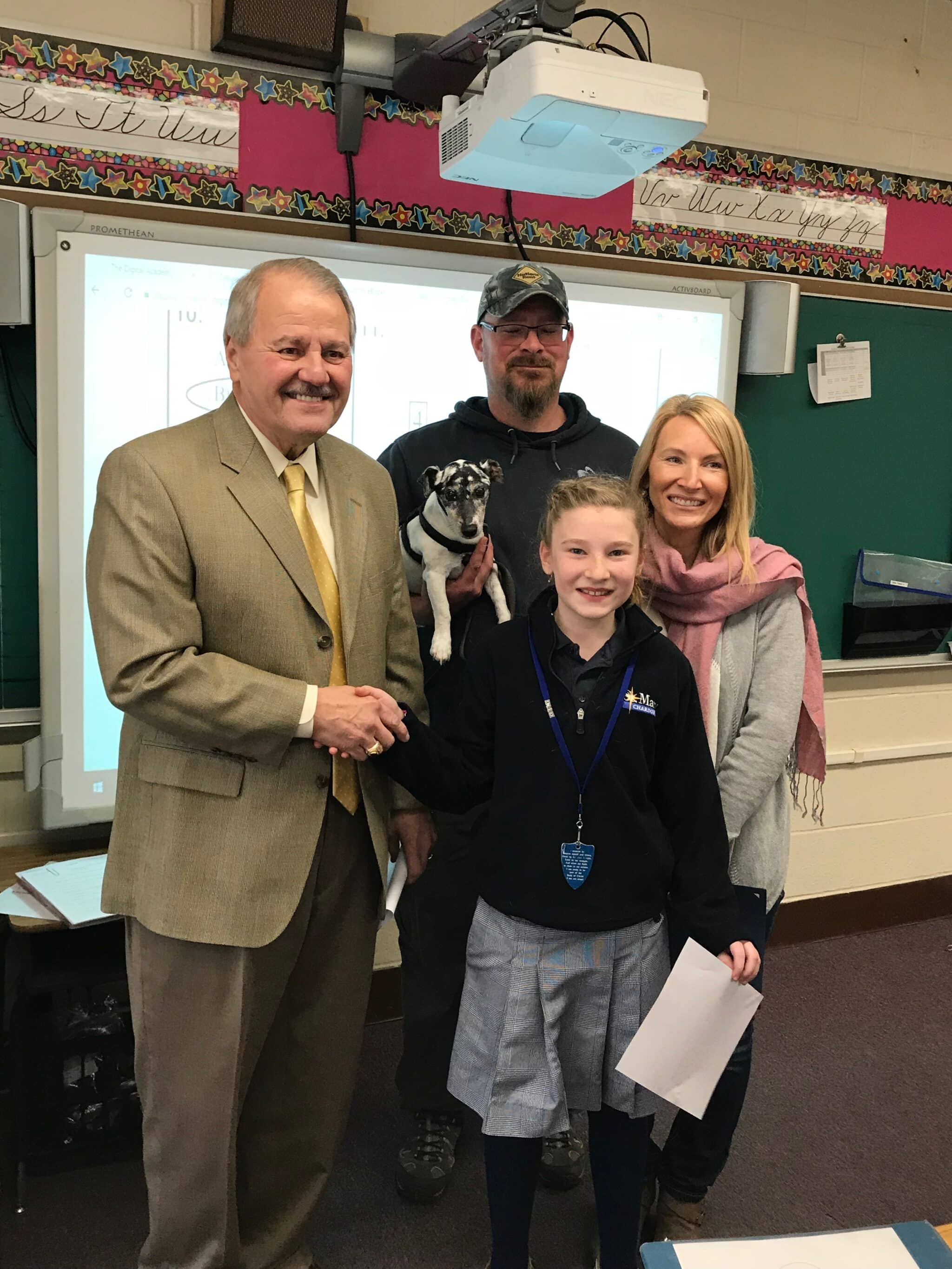 Each year, Geauga County Auditor Frank Gliha awards the first dog tag of the New Year to a local fourth- or fifth-grader who completes the best essay on his or her pet. St. Mary fourth-grader Lilianna Dillworth was surprised with a visit from the auditor, her family and her dog Hank at school to make the announcement of her win.