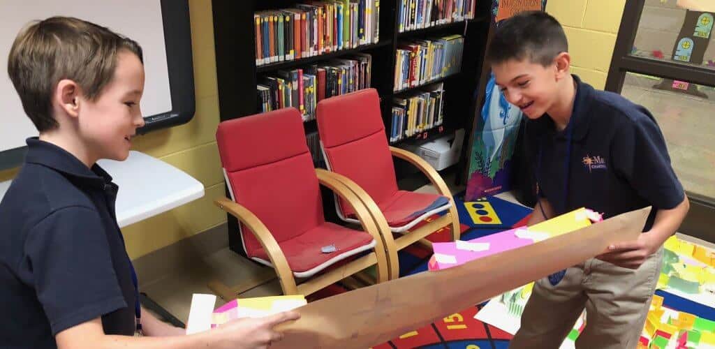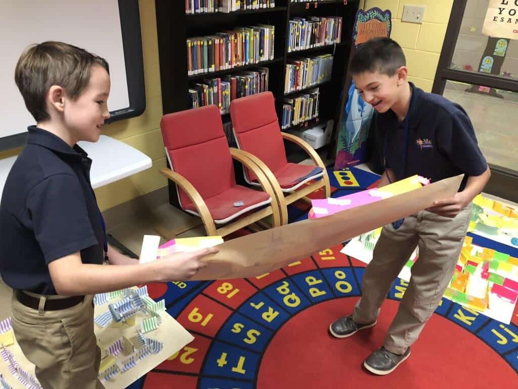 Fourth- and fifth-graders took on a corn maze design challenge. They were challenged to design a maze that a marble could get out of without using their hands to manipulate it. In addition, the teams wrote a persuasive jingle to get people to come to their maze.