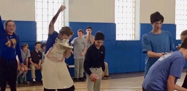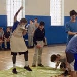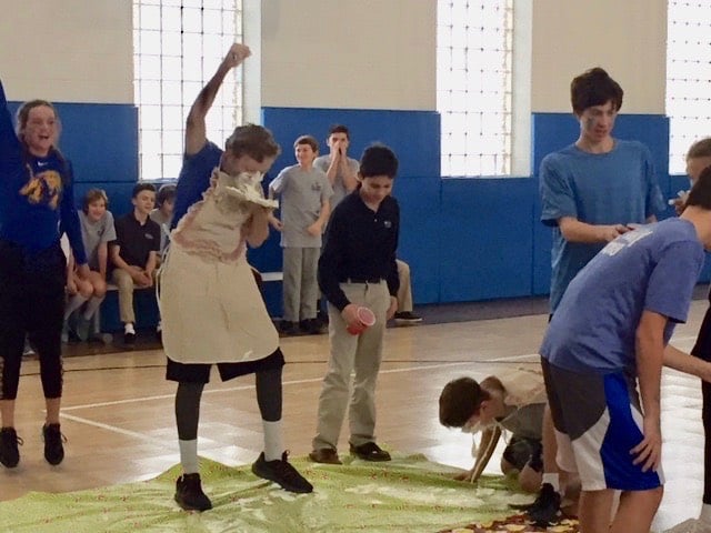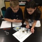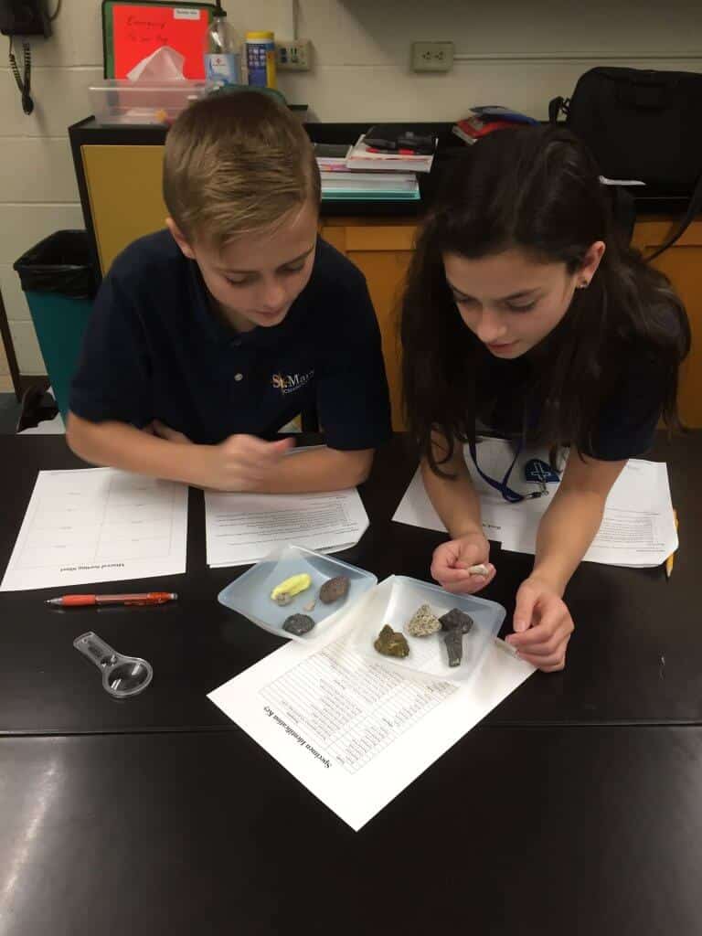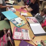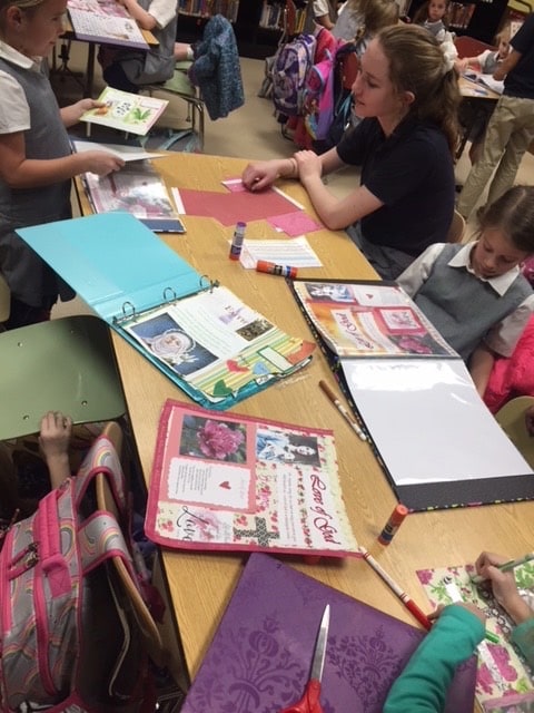 The students are working together to create a scrapbook page for each saint they learn about with the help of their junior high partners. Meetings are held once a month, which allow the students to have some time after school together learning and having fun.