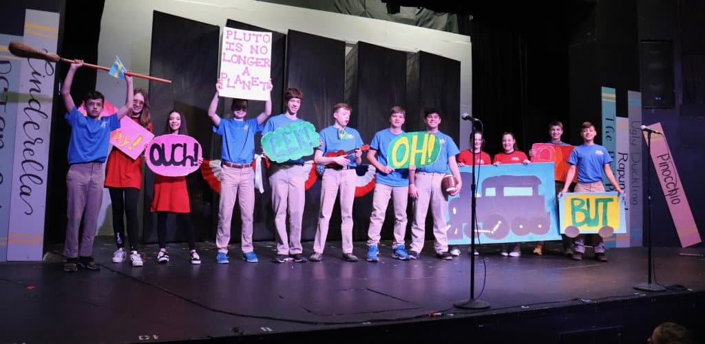 The eighth-grade boys used their deep voices and dance moves to teach multiplication of three in a fun memorable way in the song “Three’s a Magic Number.”