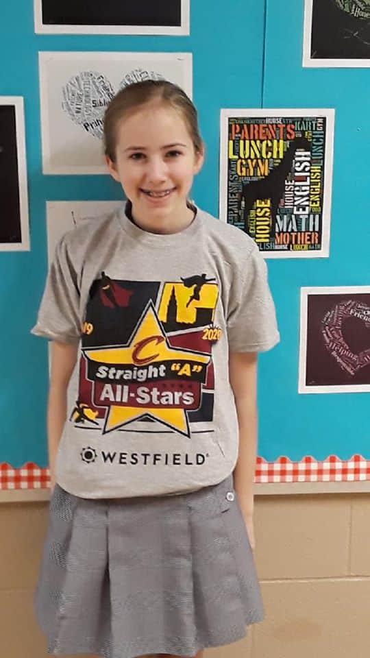 All students who earn straight A’s during the first or second grading periods will receive a personalized Straight “A” All-Stars certificate and special prize. In addition, 300 students will be randomly selected each grading period to receive two tickets to a pre-selected Cavaliers home game and an official Straight “A” All-Stars T-shirt. St. Mary’s eighth grader Zoe Virant won the tickets this grading period.