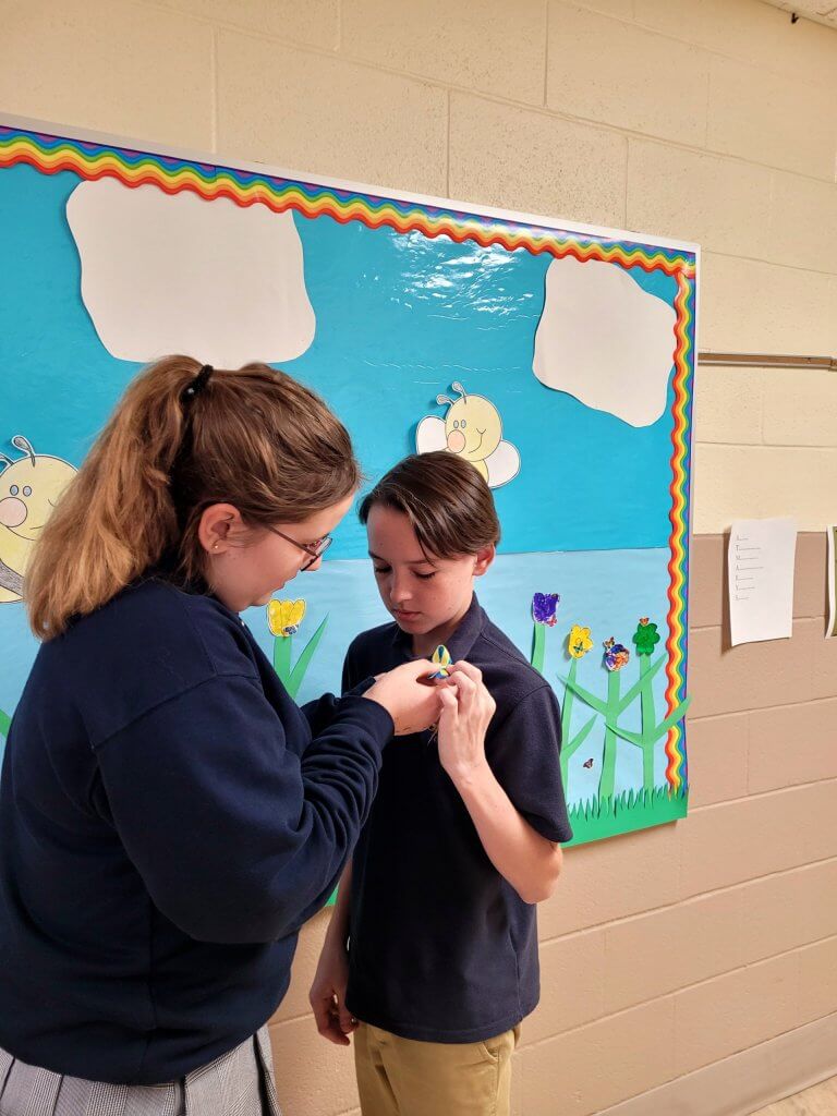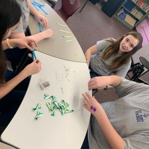St. Mary’s seventh-grade class has been working on making blue and yellow ribbons. The ribbons will be given to donors so they can proudly wear them and show their support for the people of Ukraine.