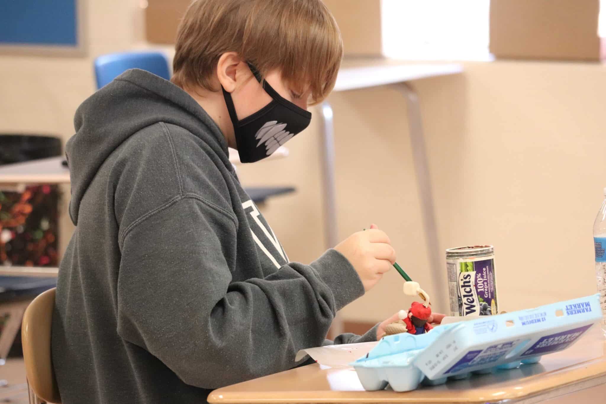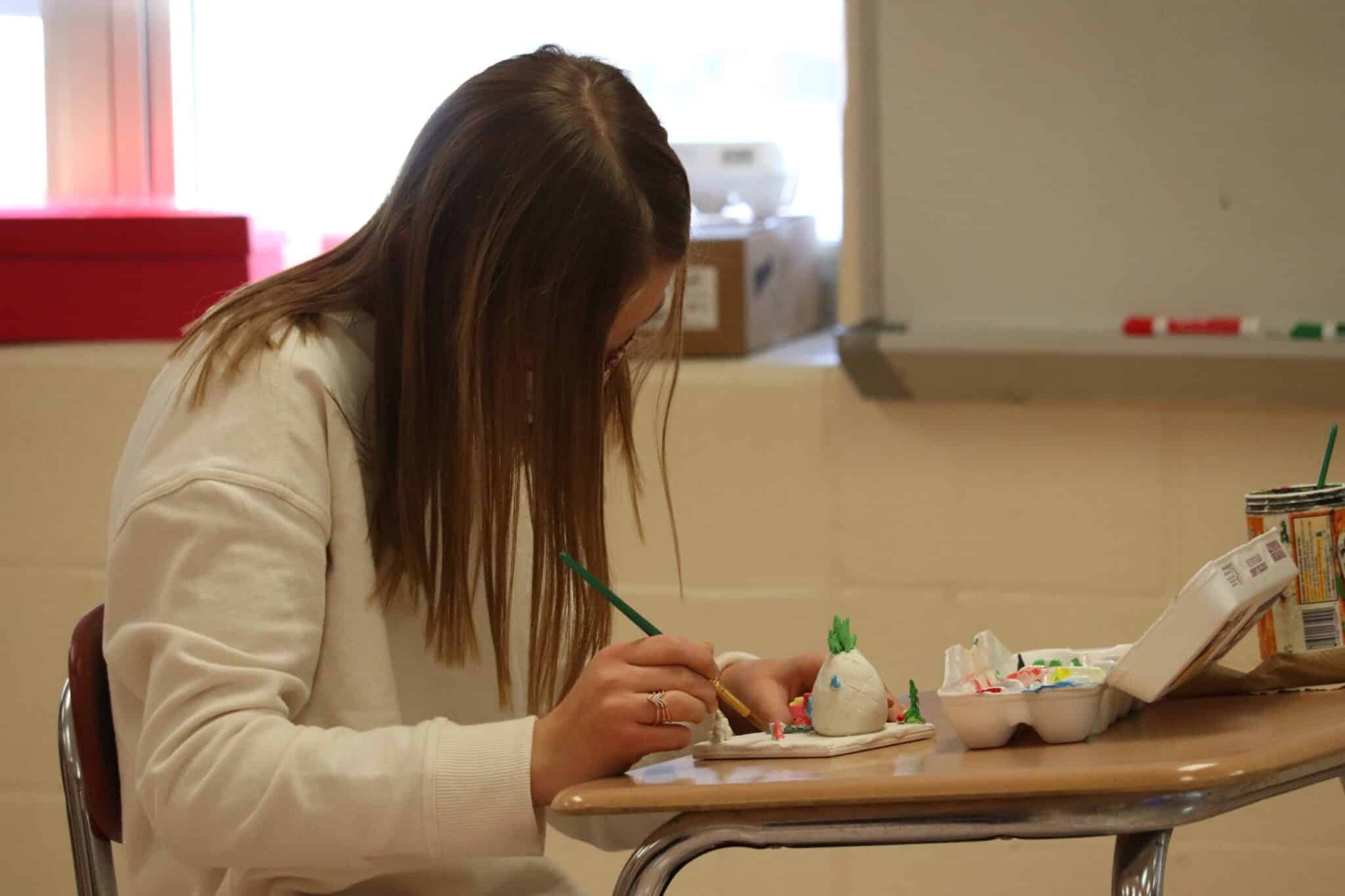 Eighth-grade students at West Geauga Middle School are currently working on a sculpture project in art classes. Each student designs and creates a model using Sculpey clay. The projects are then dried and painted. Art teacher Kim Mathis uses the project to address many of the elements of the middle school art curriculum.