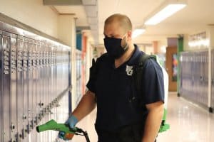 Cleaning protocols at the West Geauga Local School District have evolved throughout the COVID-19 pandemic. The custodial and maintenance departments have been safely disinfecting the school buildings and transportation vehicles using sanitizing backpacks with chemicals that are safe and effective.