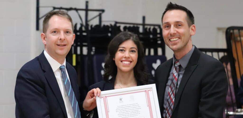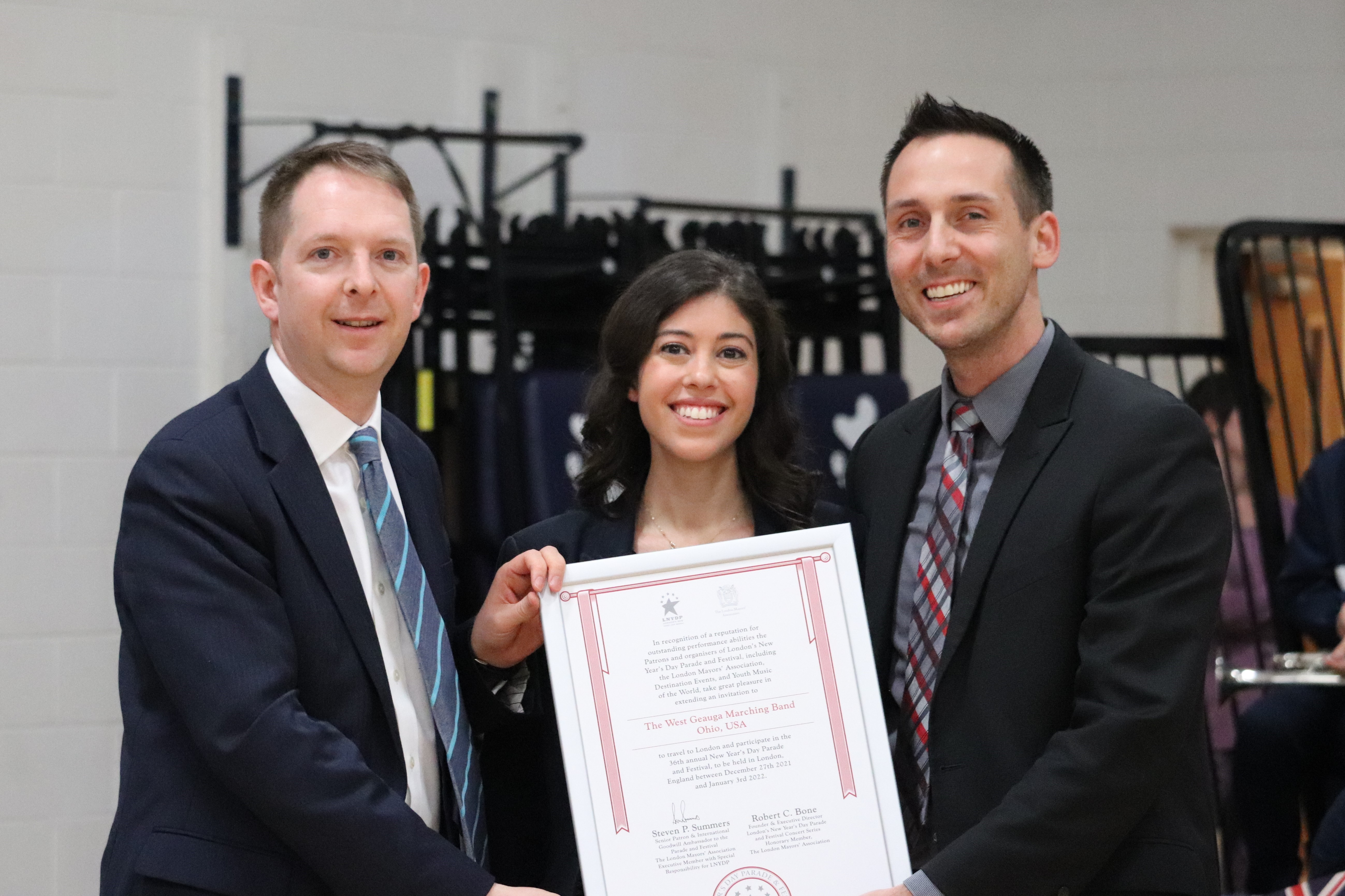 The West Geauga Marching Band has been invited to perform in the 2022 London New Year’s Day Parade. At an all-school assembly on Feb. 12, Jonathan Whaley, director of international participation, Robert Bone, co-founder of the parade, and Steve Summers, former Westminster City Councillor and Lord Mayor, presented the invitation to band directors Jason Branch and Taylor DeSapri. An enthusiastic band performed for the students and guests. The band officers presented gifts to the delegation from London.