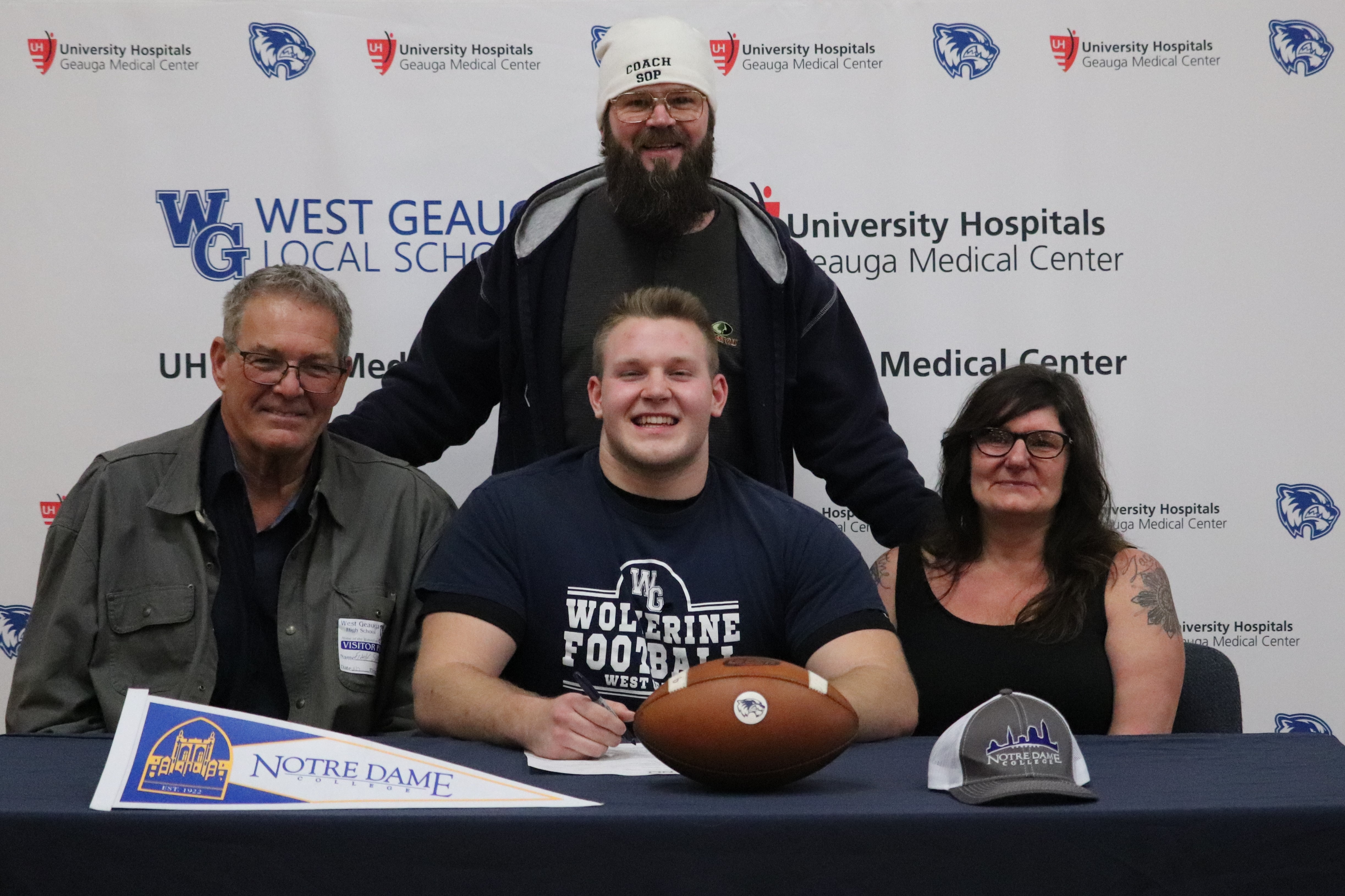 West Geauga High School football players Zach Slapnicker and Levi VeVerka have both decided to play football in college. Zach has signed with Notre Dame College in South Euclid and Levi has signed with Walsh University in North Canton. Both players were honored as they signed their letters of intent before family, teammates, classmates and head football coach Adam Sopkovich.