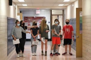 Juniors and seniors acted as tour guides to give the current eighth-graders a firsthand look at high school, stressing the important aspects. Small groups of students toured the building throughout the day to help familiarize themselves with the building.