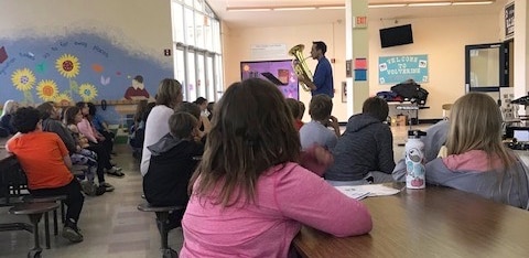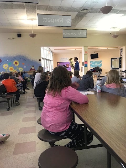West Geauga marching band director Jason Branch recently recruited fourth-grade students for fifth-grade band at Lindsey Elementary School...