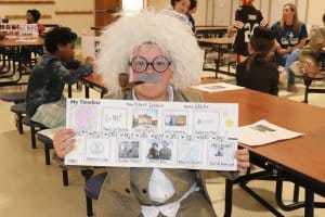 The second-grade class presented their “Wax Museum” projects to the first-graders. The project involved researching a famous, influential person; designing a timeline of their life; writing a presentation; and dressing up to resemble the person. Students did an excellent job on their presentations.
